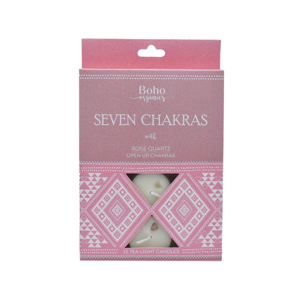 12 t-lite candles, seven chakras with small rose quartz crystal - open up chakras