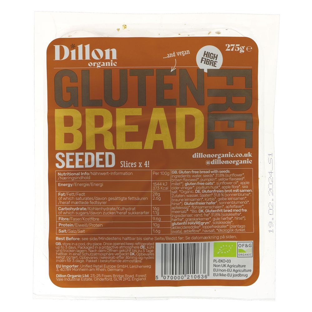 Delicious Gluten free sliced bread packed full of organic seeds including Sunflower, Flax, and pumpkin. No preservatives, additives, gums, fillers or other nasties. Gluten and dairy free, vegan and low carb. The Dillon Organic founder designed this product to be filling and suitable for diabetics. It is made using a gentle sourdough, without the use of yeast or other baking agents. Enjoy! Gluten Free, Vegan, organic, low carb, suitable for diabetics, yeast free, no fillers, non gmo, Low Gi, Low GL, filling, Energising, and high fibre.
