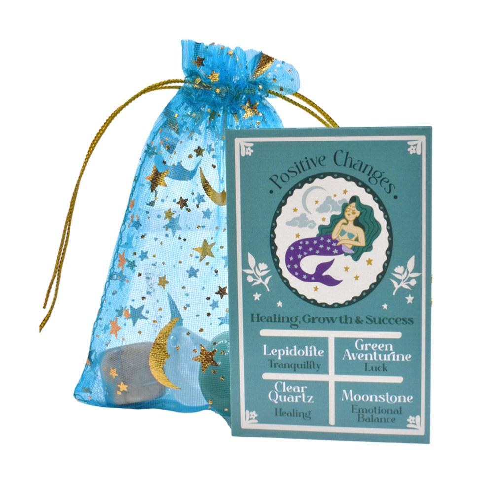 The ‘Positive Changes’ healing bag has been specially curated to provide healing within the process of change and transformation. Lepidolite and clear quartz work together to clear worries, amplifying a calm and cleansed mindset that is easy to work with. Green aventurine provides growth and abundance and is known as the stone of opportunity, working with moonstone to create a cyclical change that can be maintained. Moonstone is also uniquely tuned to the divine feminine and hints at new beginnings, especially through travel and different experiences. Chosen for their abilities to bring about positive renewal, this crystal bag is perfect for those seeking something that often seems impossible, but can be achieved on a journey of self-belief.